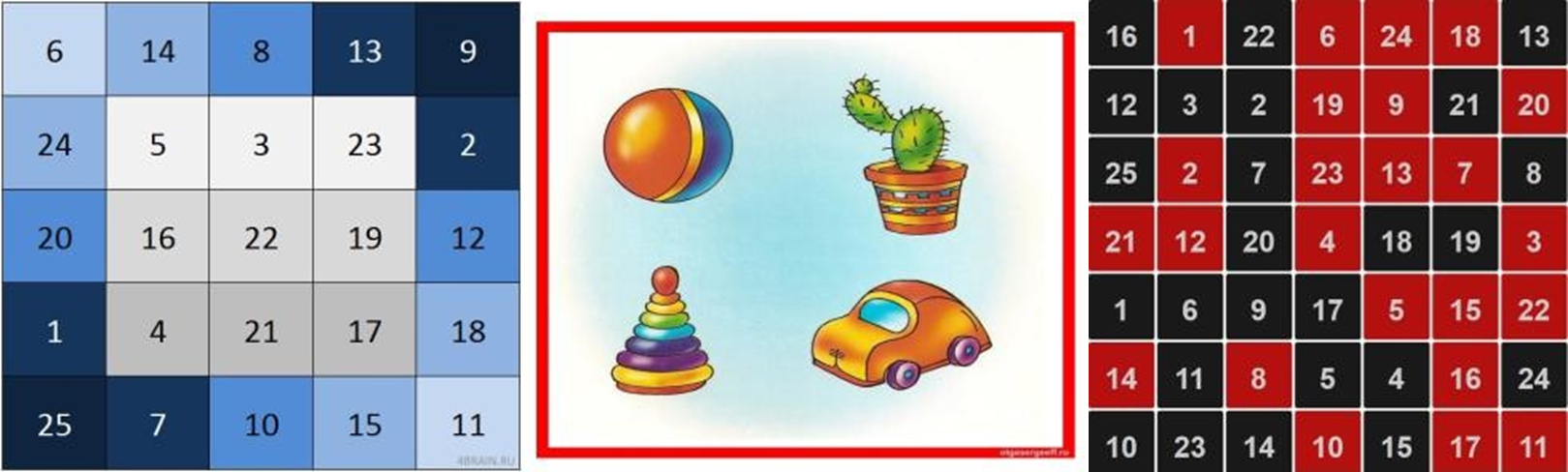 Балаларды зерттеуде кеңінен қолданылатын әдістерге: «Равеннің прогрессивті матрицалары», «10 зат» әдістемесі, «10 сөз» әдістемесі, «Шульте кестелері», «Гобовтың қызыл-қара кестелері», «Қиылған суреттер», «Отбасы суреті», «Үй, ағаш, адам»,